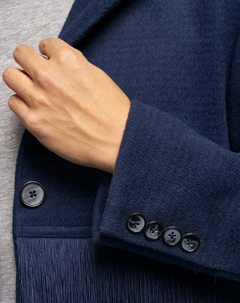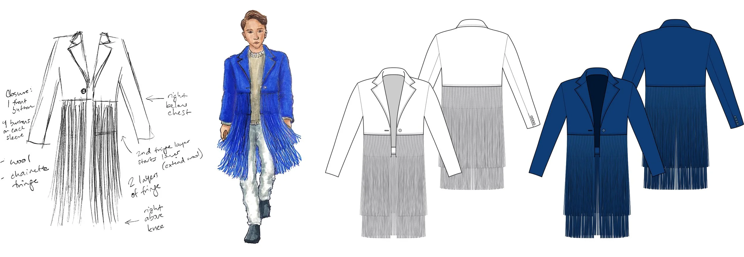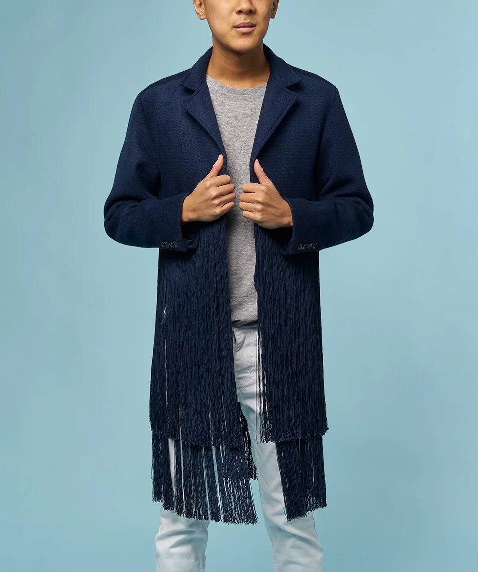Fringe on clothing provides dramatic flair, lively energy, and casual splendor to any style of outfit; it transforms straightforward silhouettes by creating fluid, dynamic shapes and rapturous movement. Inspired by playful, glamorous pieces seen in womenswear that incorporate fringe in visually powerful ways and wanting to solve for what I feel to be a lack of chic, sophisticated fringe-adorned styles in menswear, I designed this men’s wool topcoat with an entire lower half comprising two thick tiers of chainette fringe.